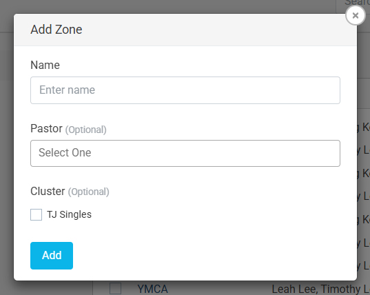 Type in the name of the Zone you would like to set-up an select the name of the Pastor over the Zone if it is applicable.