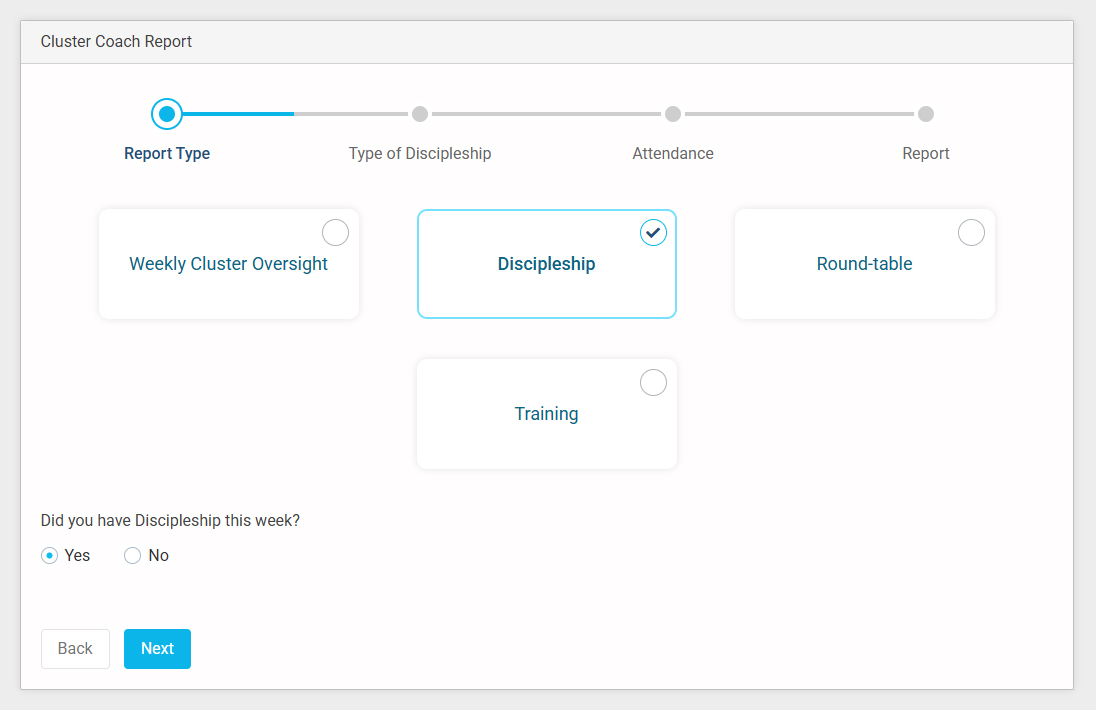 - Then answer the question, “Did you have Discipleship this week?” Select Yes or No as applicable. By default, it is set to Yes.