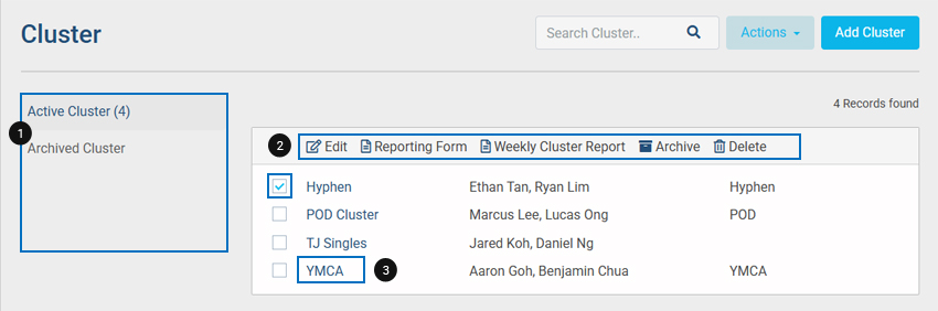 - Click on the checkbox to reveal additional options in the action bar. From there, you can perform actions such as Edit, Create Reporting Form, Weekly Cluster Report, Archive, and Delete.