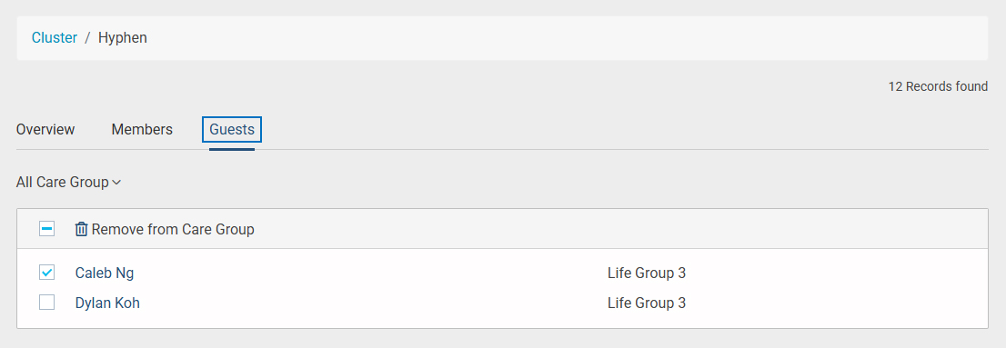 - Similarly, you can click on the Guests tab to view all guests associated with this cluster. These guests belong to a care group within this cluster. From here, you have the option to remove a guest from the care group.