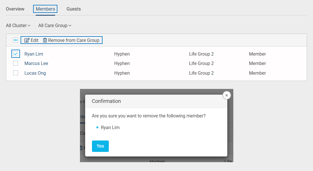 - When you click the "Remove from Care Group" option, a confirmation message will appear asking whether you want to remove the following member. Click "Yes" to confirm and permanently delete the member from that Care Group.