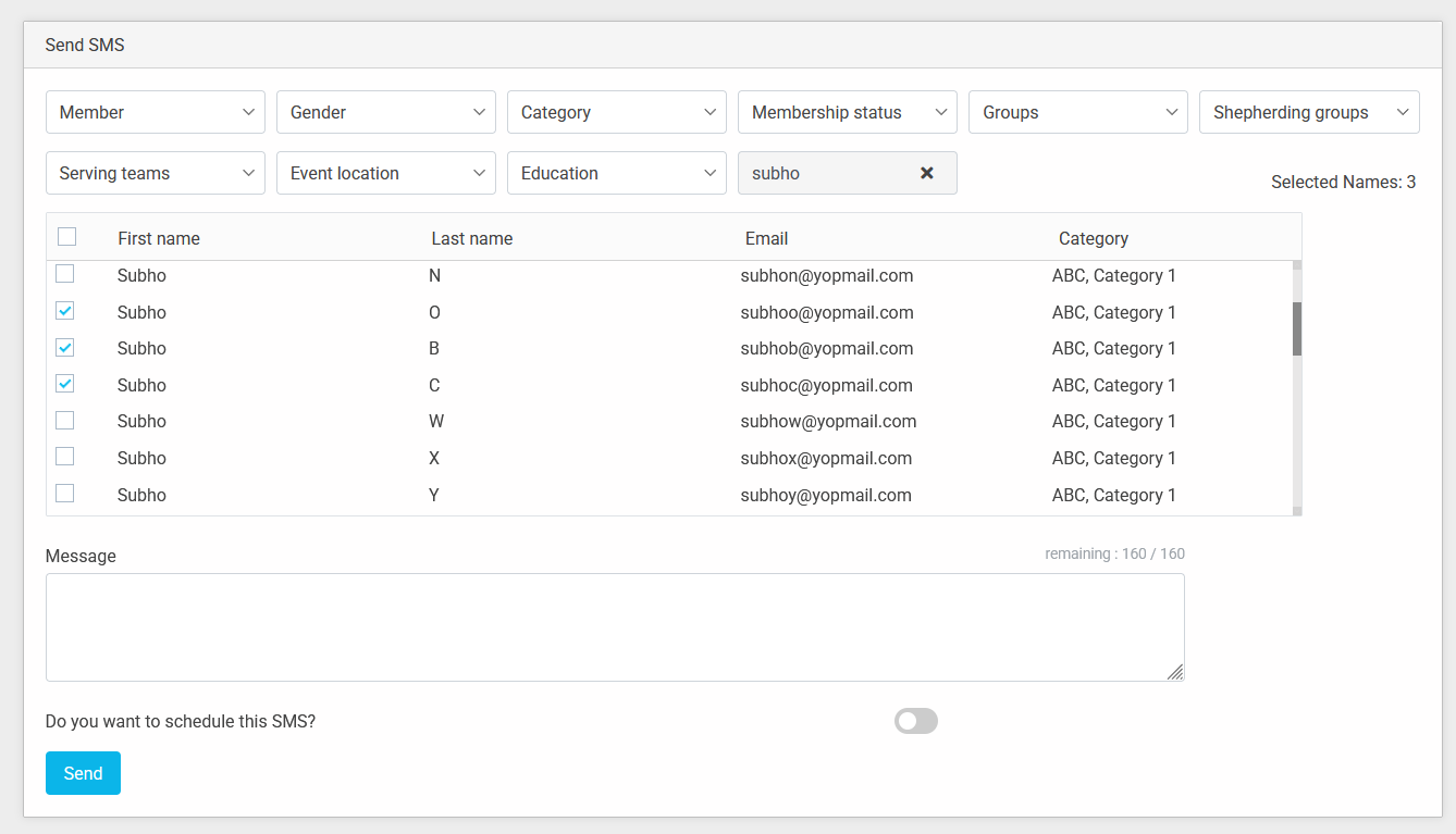 • Use the drop-down options and search bar to find the list of members names. Then select the member names want to send SMS. Into the Message text-box you can type SMS content. Finally press on Send button to start sending.