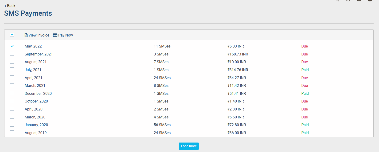 • You can manage SMS billings from the Actions drop-down button Payments option. This page lists all paid and due invoices in monthly basis. You can download invoice and make payment for any due invoices.