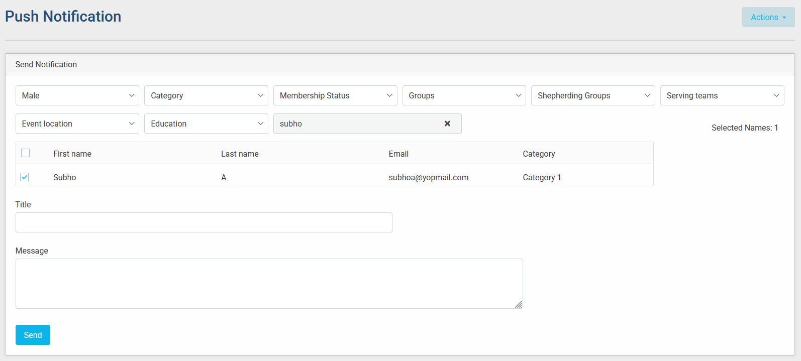 Use the filter to list app users names. Choose names, type push title and message body. Finally send the push by clicking on the Send button.