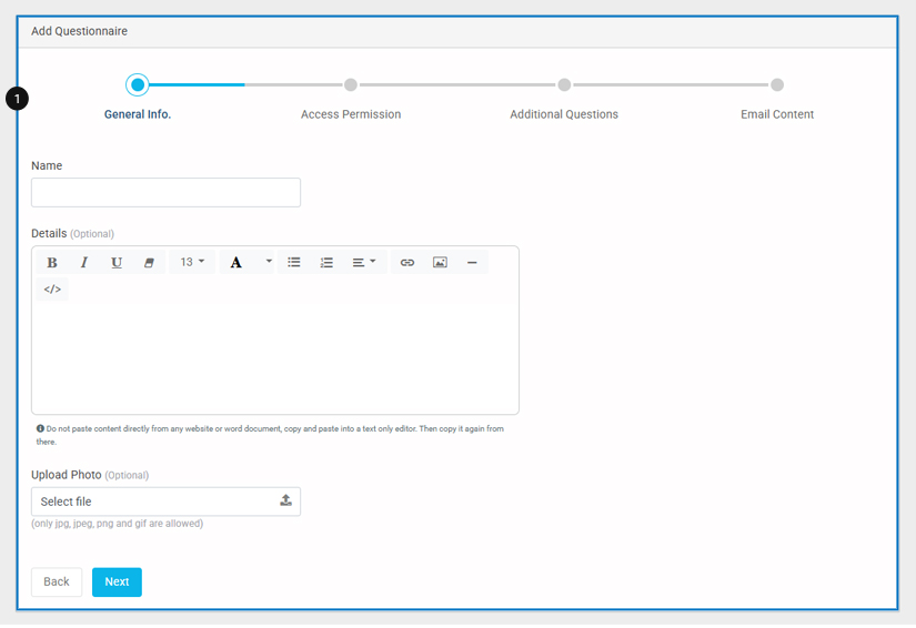 • Upload Photo (Optional): Upload an image related to the questionnaire.