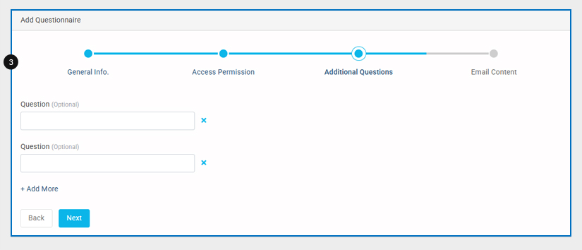 • Question (Optional): Enter a question. Click + Add More to add additional questions.Use the remove (×) icon to delete a question if needed.
