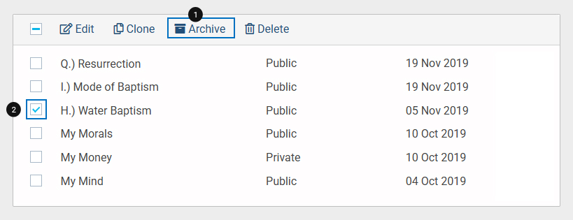 Select the checkbox next to the form name. An option called "Archive" will appear in the top bar. Click on the option.