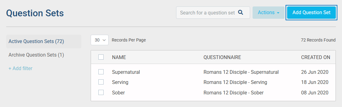 • Go to the Education tab on the left panel. Next, open Spiritual Assessment and select Question Sets, where you can Add Question Sets.