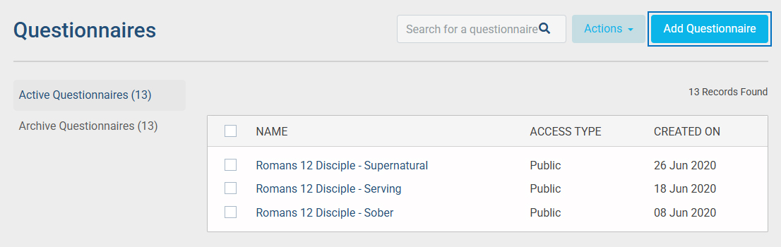 - Click on Add Questionnaire to create a new Questionnaire.