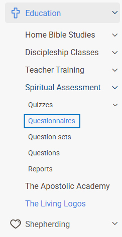- Go to the Education tab on the left panel. Next, open Spiritual Assessment and select Questionnaires.