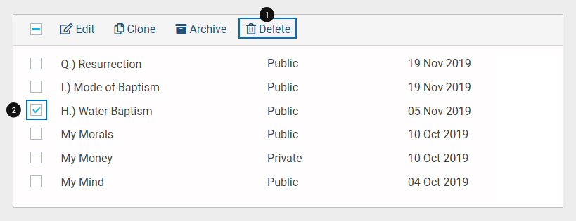 • Select the checkbox next to the Questionnaires name. An option called “Delete” will appear in the top bar. Click on the option.