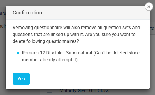 • When you click the Delete option, a confirmation message will appear asking whether you want to delete the questionnaire. Click "Yes" to confirm and permanently delete the questionnaire and also remove all question sets and questions that are linked up with it.