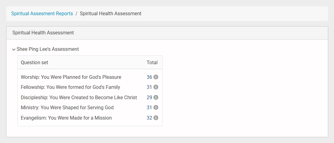 - Here is the result for that user. You can see the questions along with the total score they received for each question set.