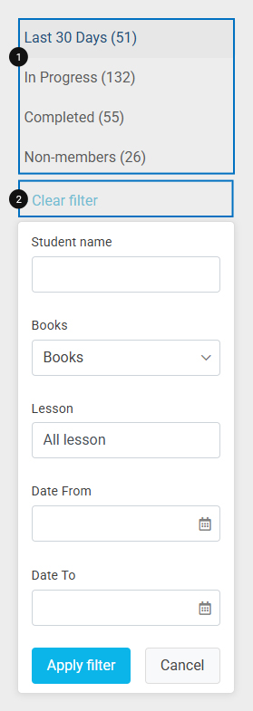 The Custom Filter allows you to filter data by student name, Books, Lessons, and submitted date range (From and To). You can use this filter to narrow down specific data.