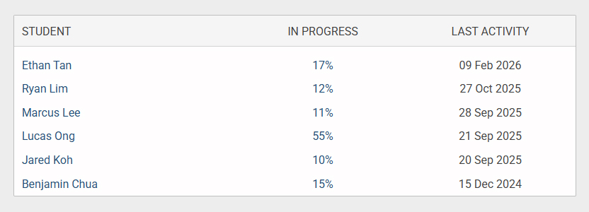 2.The In Progress section shows students who are currently enrolled in courses. It also displays their progress percentage, indicating how much of the Quizzes they have completed.