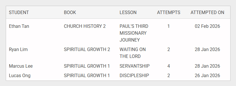 1. The Last 30 Days section displays students’ activity over the past 30 days in their Quizzes. It also shows the last attempted date and the total attempts on the lesson.