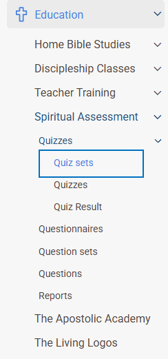 - Go to the Education tab on the left panel. open Spiritual Assessment, From there navigate to the Quizzes section and click on Quiz sets.