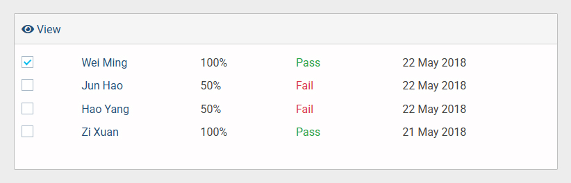 • In the Results section, select the checkbox next to a user’s name to display the available view option in the top bar.