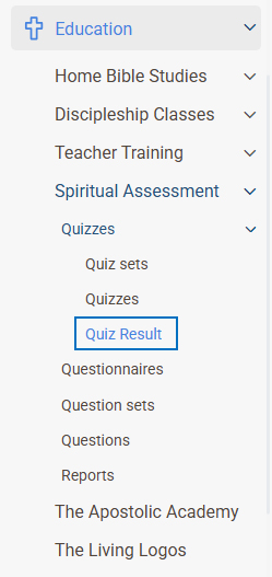 • Go to the Education tab on the left panel. open Spiritual Assessment, From there navigate to the Quizzes section and click on Quiz Result.