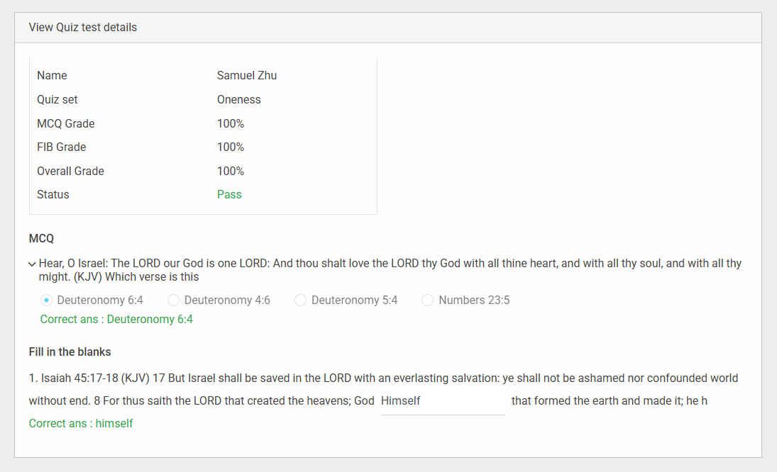 • This is the detailed results page that appears after clicking the View option, showing the user’s quiz information, grades, answers, and correct responses.