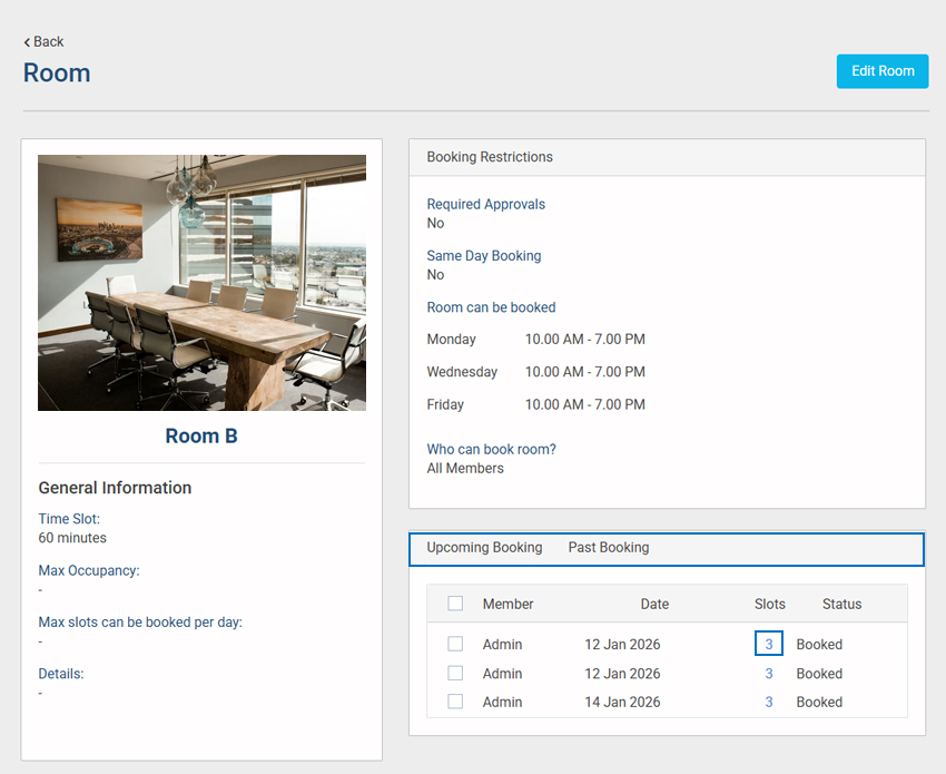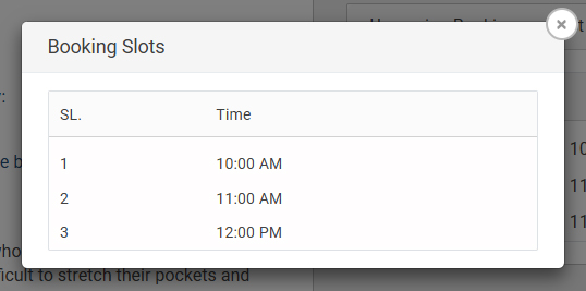 - By clicking the total slot number for a selected day, you can view all booked slot times for the room.