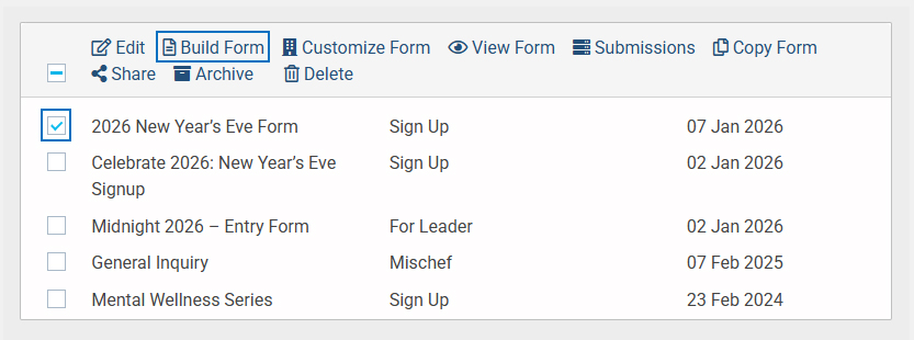 - Select the checkbox next to the form name. An option called “Build Form” will appear in the top bar. Click on the option.
