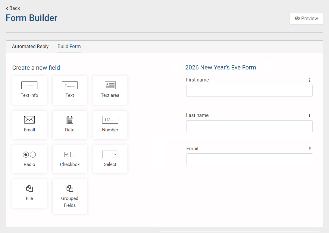 - From the “Create a New Field” section, click on any of the following fields. A modal will open displaying the settings for each input field, which are explained below.