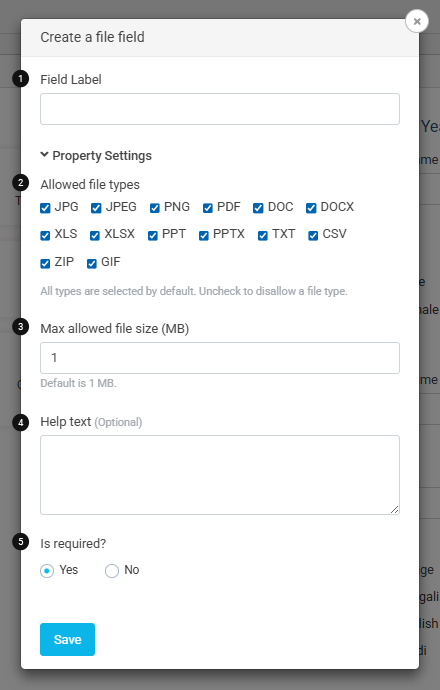 The File field is used to collect files from users through a input field.There are several configuration options available for the file input Field, as explained below: