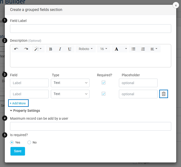 The Grouped Fields are used to collect multiple pieces of data from users at the same time through multiple input fields. Users can add multiple rows to enter more data.There are several configuration options available for the file input Field, as explained below: