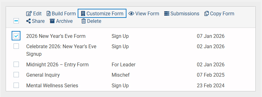 - Select the checkbox next to the form name. An option called “Customize Form” will appear in the top bar. Click on the option.