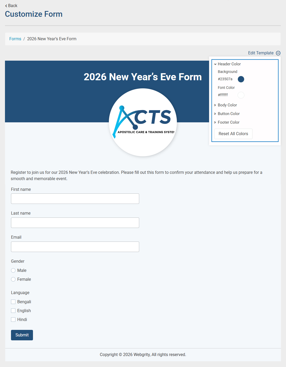Note: The colors you set here determine how the form appears. This is exactly how users will see the form when they open it.